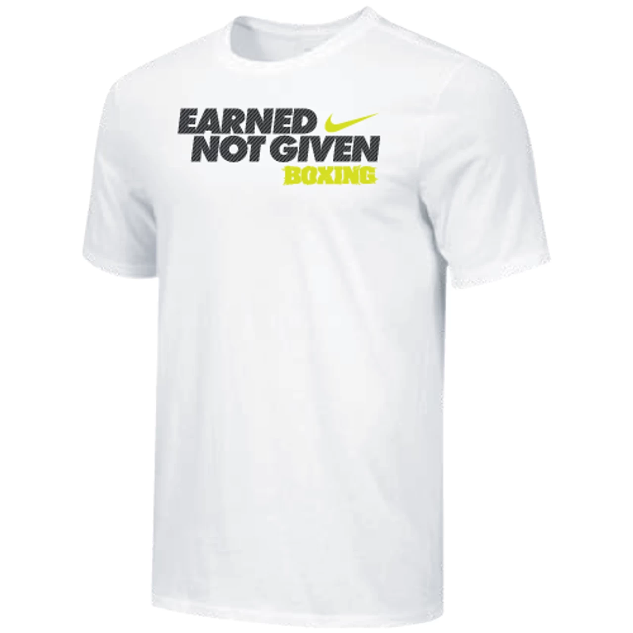 Nike Men’s Boxing Earned Not Given Tee – White/Black/Yellow – Form and function combine for a modernized look with less bulk in the Nike 100% Premium Ring Spun Cotton Tee.