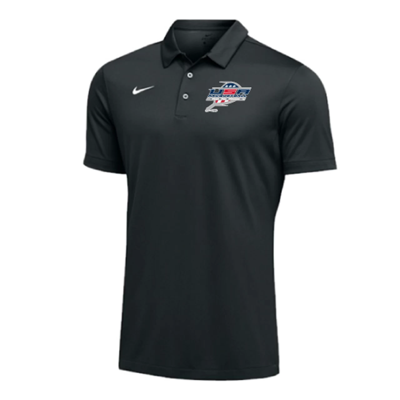 Nike Men’s USA Racquetball SS Polo – Black – USA Racquetball short sleeve polo has a Dri-FIT double knit flat back mesh body fabric with self collar. 3 Button front placket. Embroidered Swoosh design trademark at right chest. ** Please allow 10 business days from order date for production** **THIS ITEM IS NOT AVAILABLE FOR EXPRESS SHIPPING**