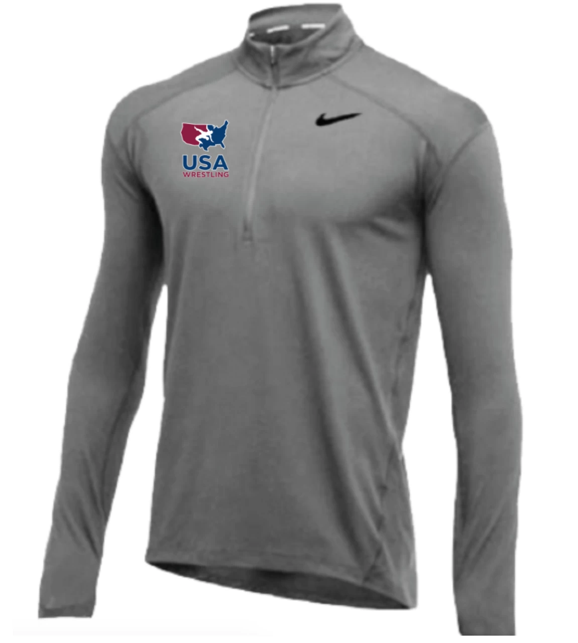 Nike Men’s USA Wrestling 1/2 Zip Top – Grey – Nike Dri-FIT technology helps you stay dry and comfortable. 1/2-zip design with a mock neck provides versatile coverage. Interior tape moves smoothly against your skin. Swoosh design trademark is printed on the right chest. 100% POLYESTER.