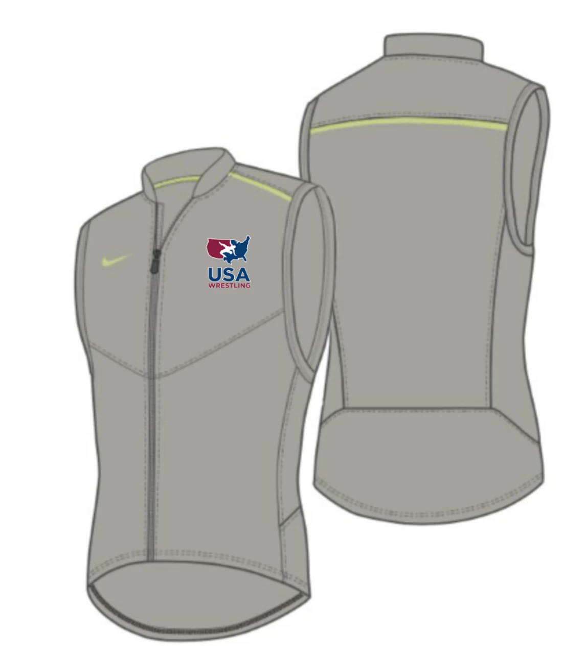 Nike Men’s USAWR Performance Vest – Pewter –Â The Nike USA Wrestling Performance Vest is made of premium lightweight, water-resistant fabric designed for maximum comfort and protection while cut to ensure full range of motion. Features full frontal zipper, long tail to provide protection and warmth to the lower back, high collar covering the neck, and embellished with reflective taping at the shoulders and across the back for visibility. 100% Polyester