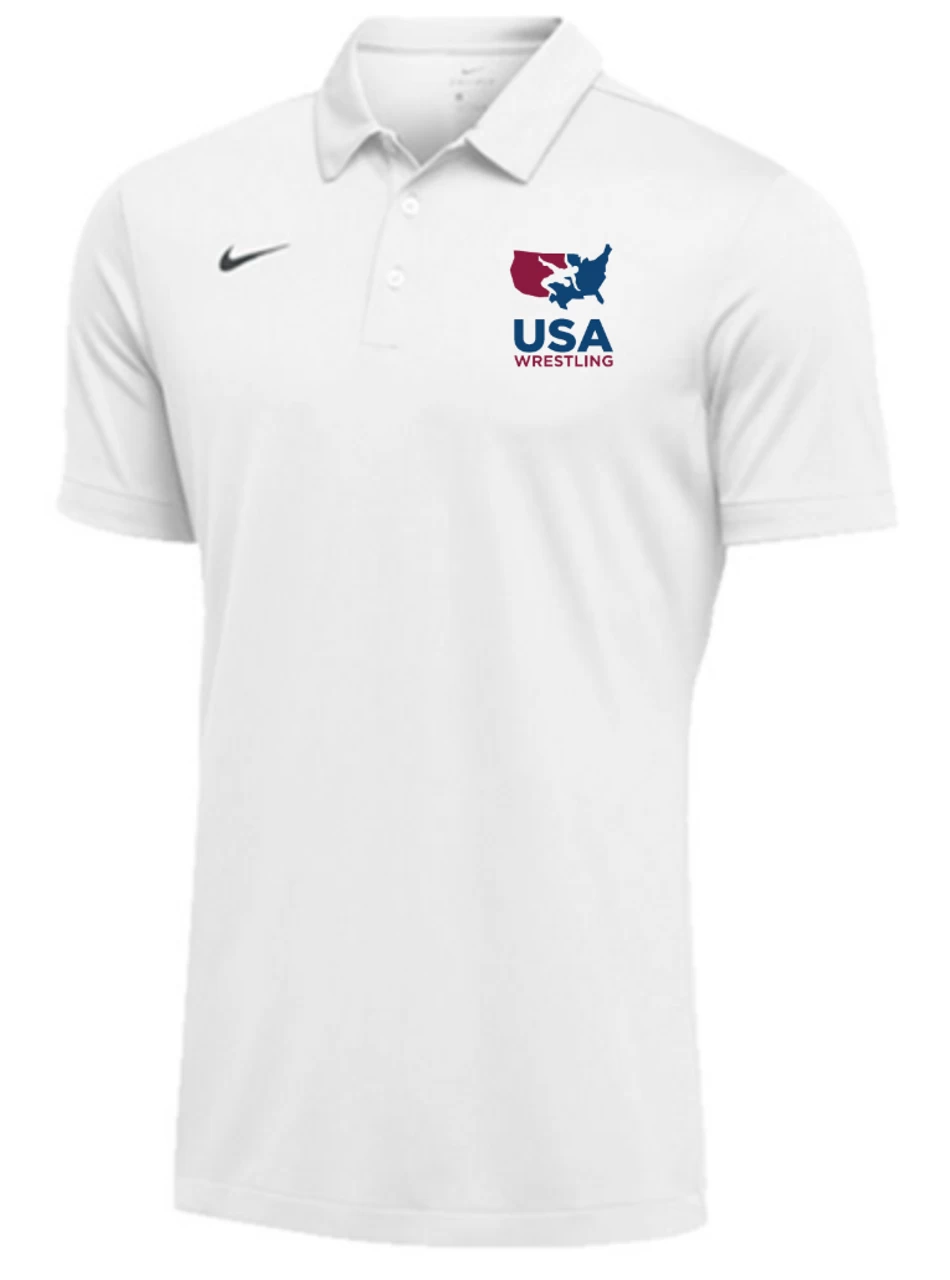 Nike Men’s USAWR SS Polo – White – USA Wrestling short sleeve polo has a Dri-FIT double knit flat back mesh body fabric with self collar. 3 Button front placket. Embroidered Swoosh design trademark at right chest. ** Please allow 10 business days from order date for production** **THIS ITEM IS NOT AVAILABLE FOR EXPRESS SHIPPING**