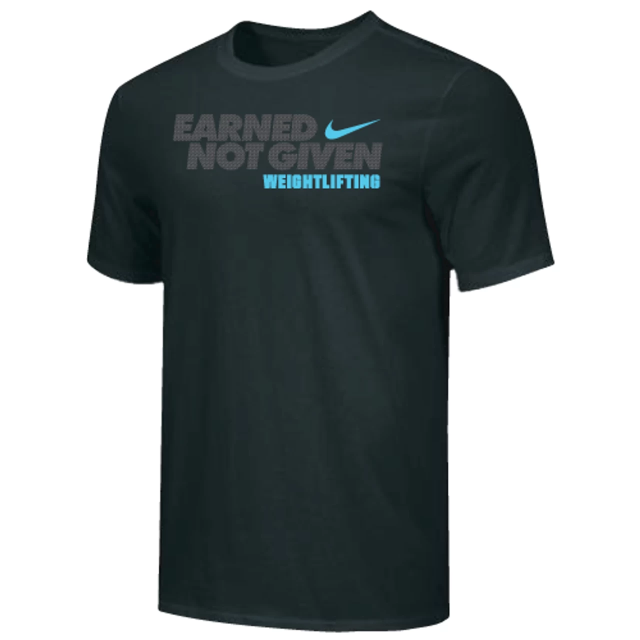 Nike Men’s Weightlifting Earned Not Given Tee – Black/Grey/Blue – Form and function combine for a modernized look with less bulk in the Nike 100% Premium Ring Spun Cotton Tee.