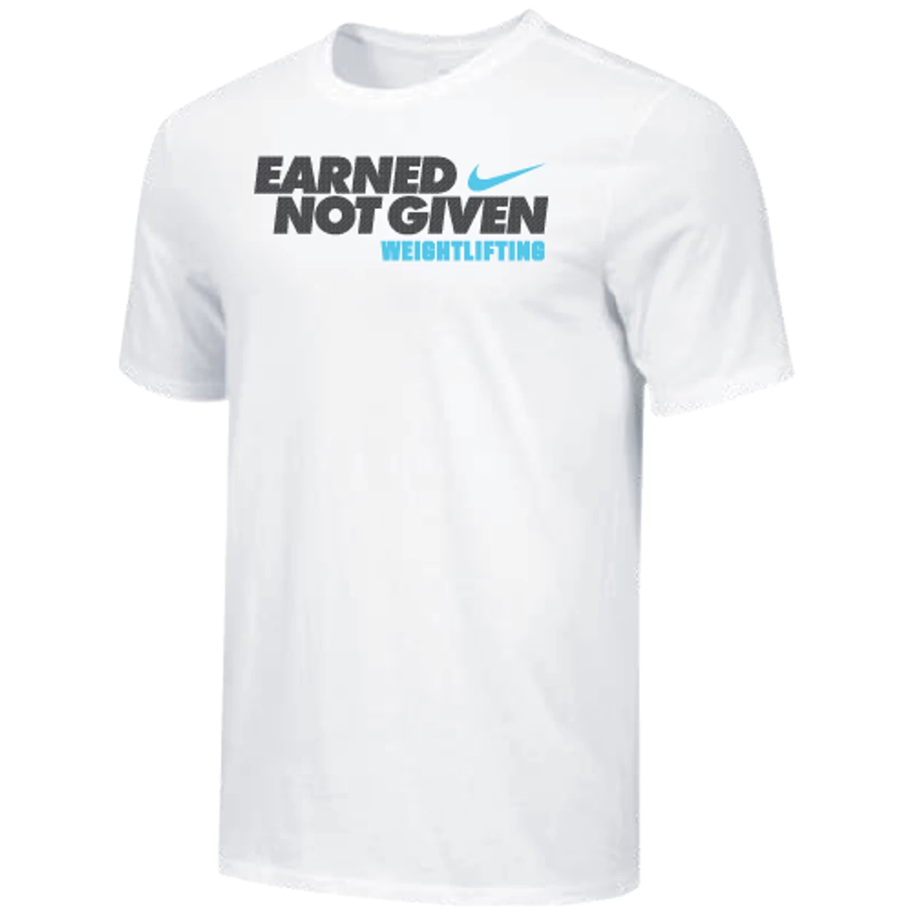 Nike Men’s Weightlifting Earned Not Given Tee – White/Black/Blue –Â Form and function combine for a modernized look with less bulk in the Nike 100% Premium Ring Spun Cotton Tee.
