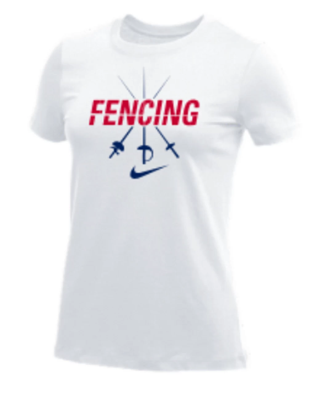 Nike Women’s Fencing Swords Tee – White – Form and function combine for a modernized look with less bulk in the Nike 100% Premium Ring Spun Cotton Tee. **Â Please allow 10 business days from order date for production** **THIS ITEM IS NOT AVAILABLE FOR EXPRESS SHIPPING**