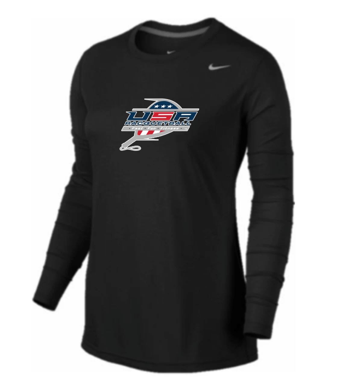 Nike Women’s USA Racquetball Legend LS Crew – Black/Black/Cool Grey – A LEGENDARY PERFORMER. Featuring a streamlined silhouette and sweat-wicking technology, the Nike Legend Women’s Long-Sleeve Training Top is a versatile, high-performance layer designed to help you elevate your training game.  100% POLYESTER                      Â