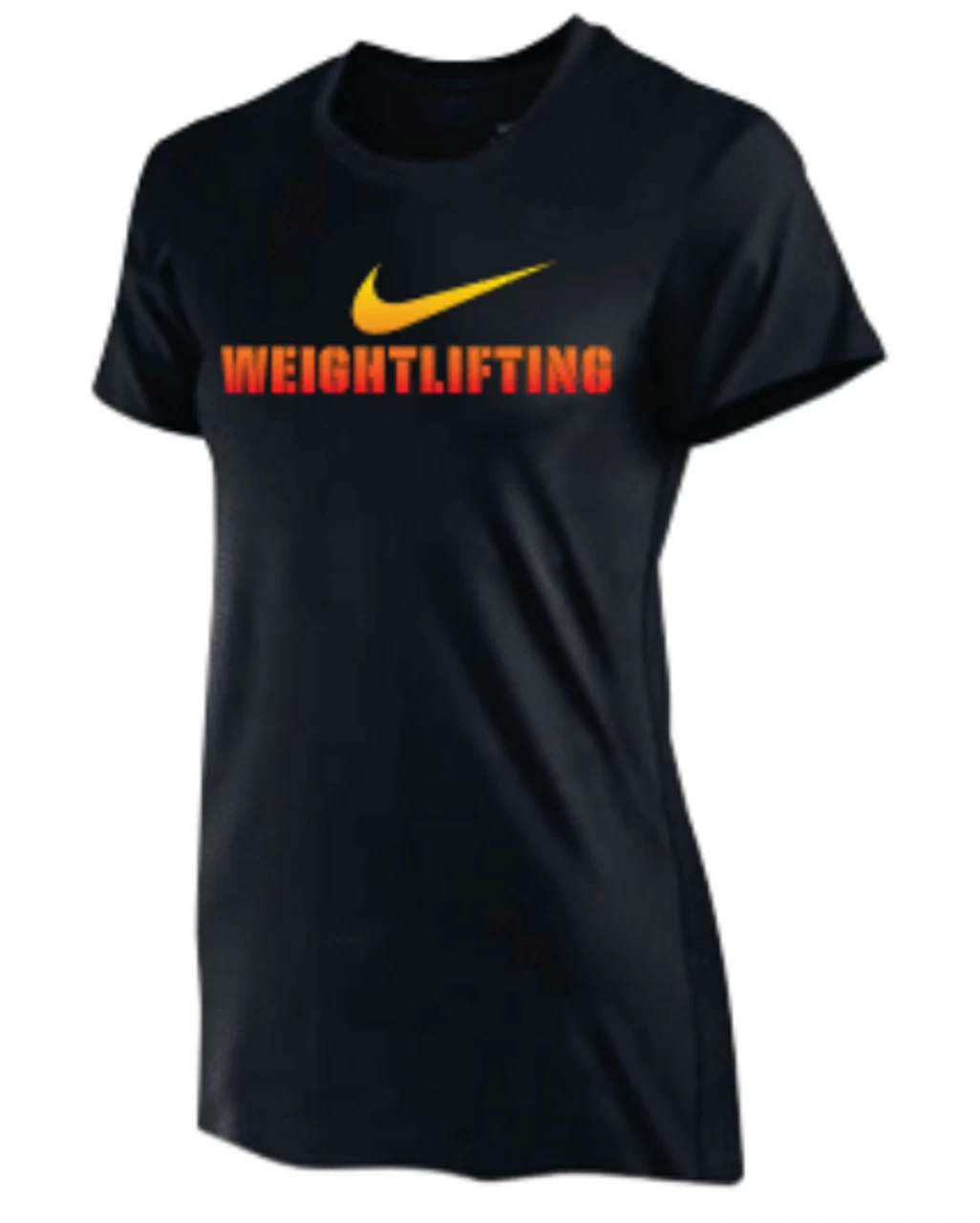Nike Women’s Weightlifting Tee – Black/Orange/Yellow – Form and function combine for a modernized look with less bulk in the Nike 100% Premium Ring Spun Cotton Tee. **Â Please allow 10 business days from order date for production** **THIS ITEM IS NOT AVAILABLE FOR EXPRESS SHIPPING**
