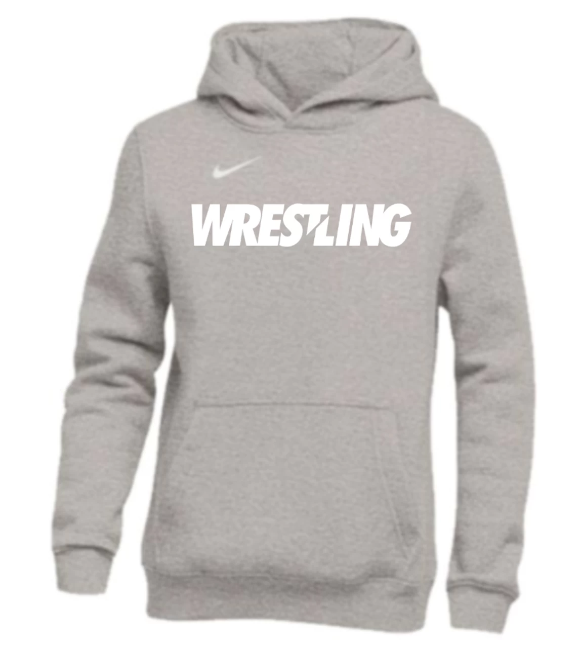Nike Youth Wrestling Pullover Club Fleece Hoodie – Long Sleeve hooded fleece with “V” at center front neck. Knit rib sleeve cuff and waistband. Drawcord at neck opening and lined hood. Center front pocket. Embroidered Nike swoosh design trademark located centered below neck opening.Â