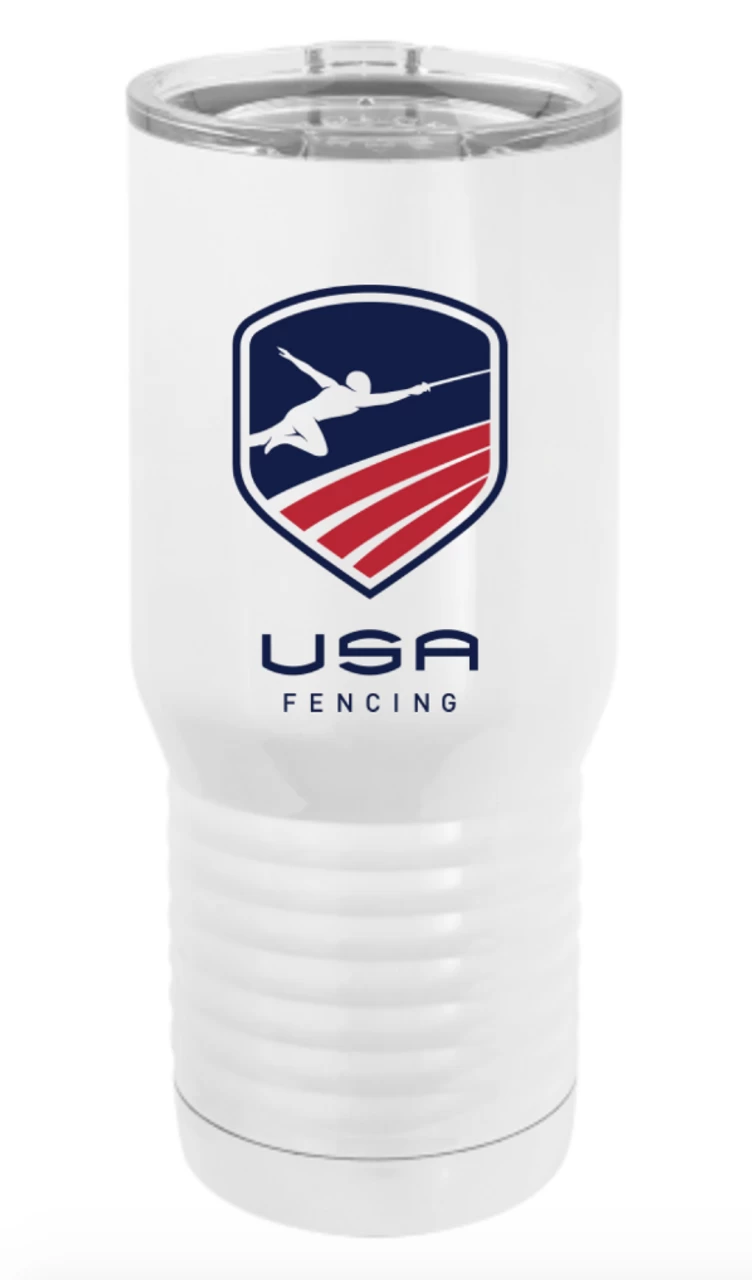 USA Fencing Polar Camel Travel Mug – 20 oz – White/Red/Blue – Stainless Steel, powder coated, double wall vacuum insulation, BPA free 20 ounce travel mug with lid. Â