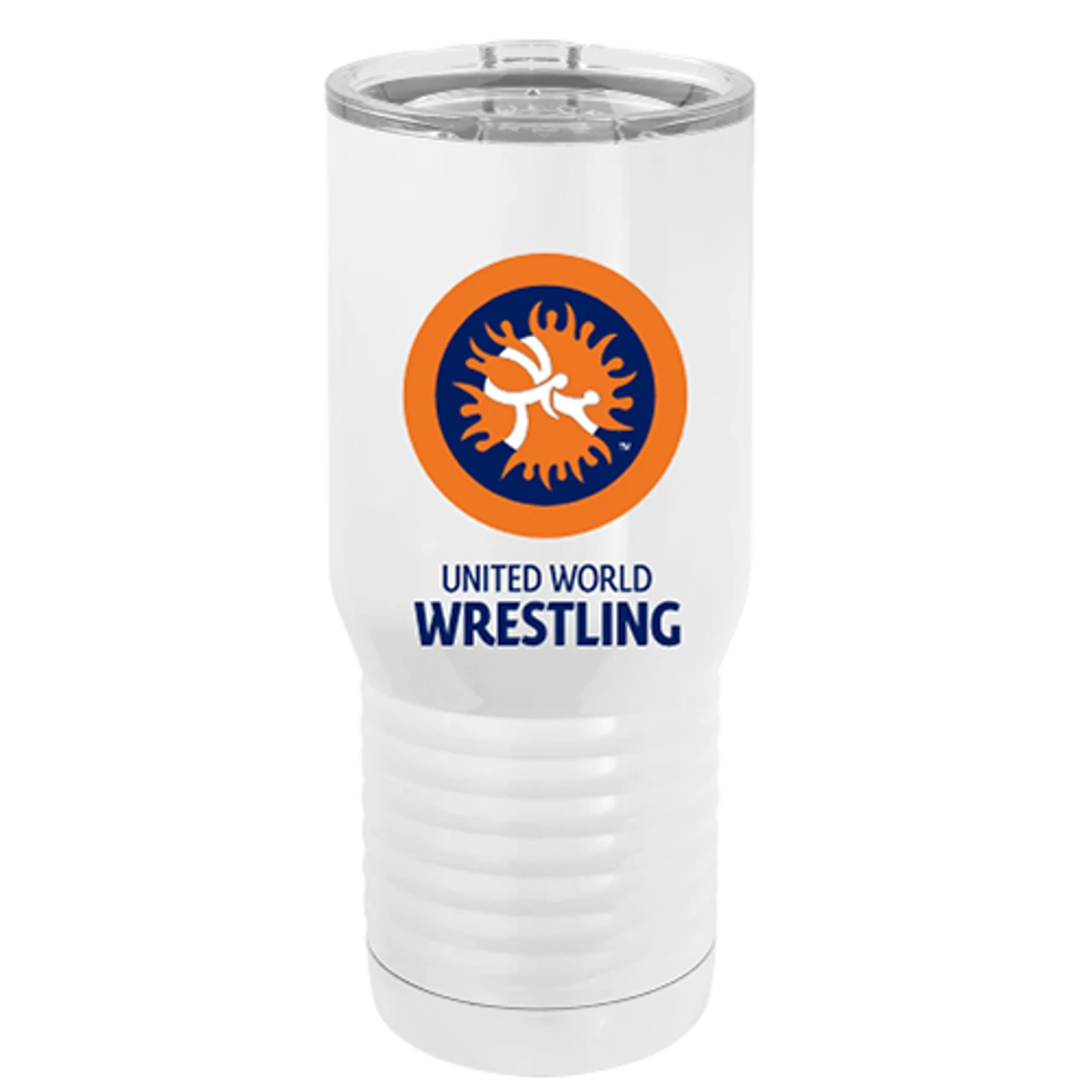United World Wrestling Polar Camel Travel Mug – 20 oz – White/Orange/Blue – Stainless Steel, powder coated, double wall vacuum insulation, BPA free 20 ounce travel mug with lid. Â
